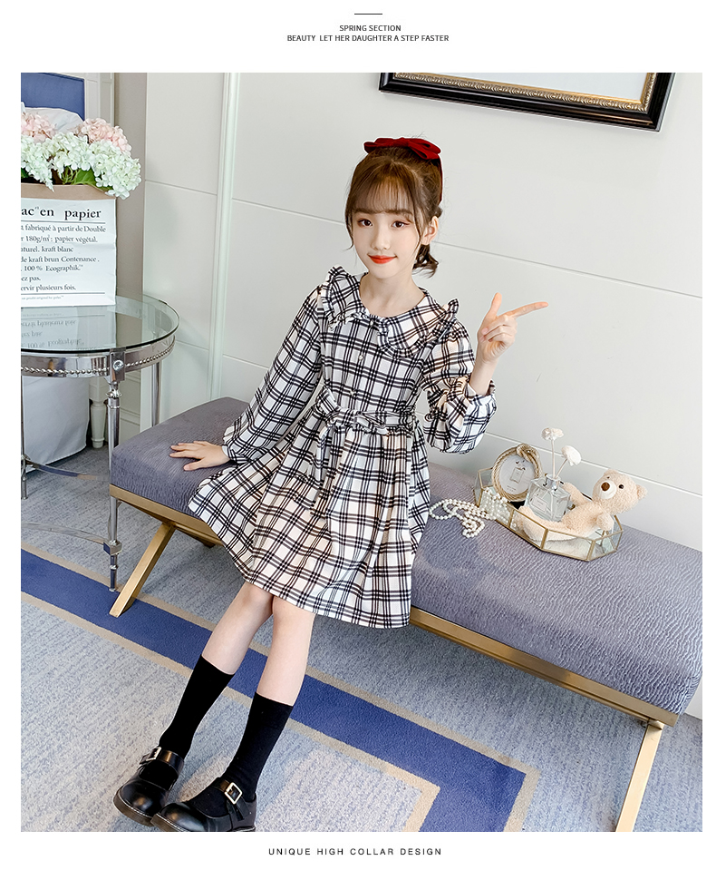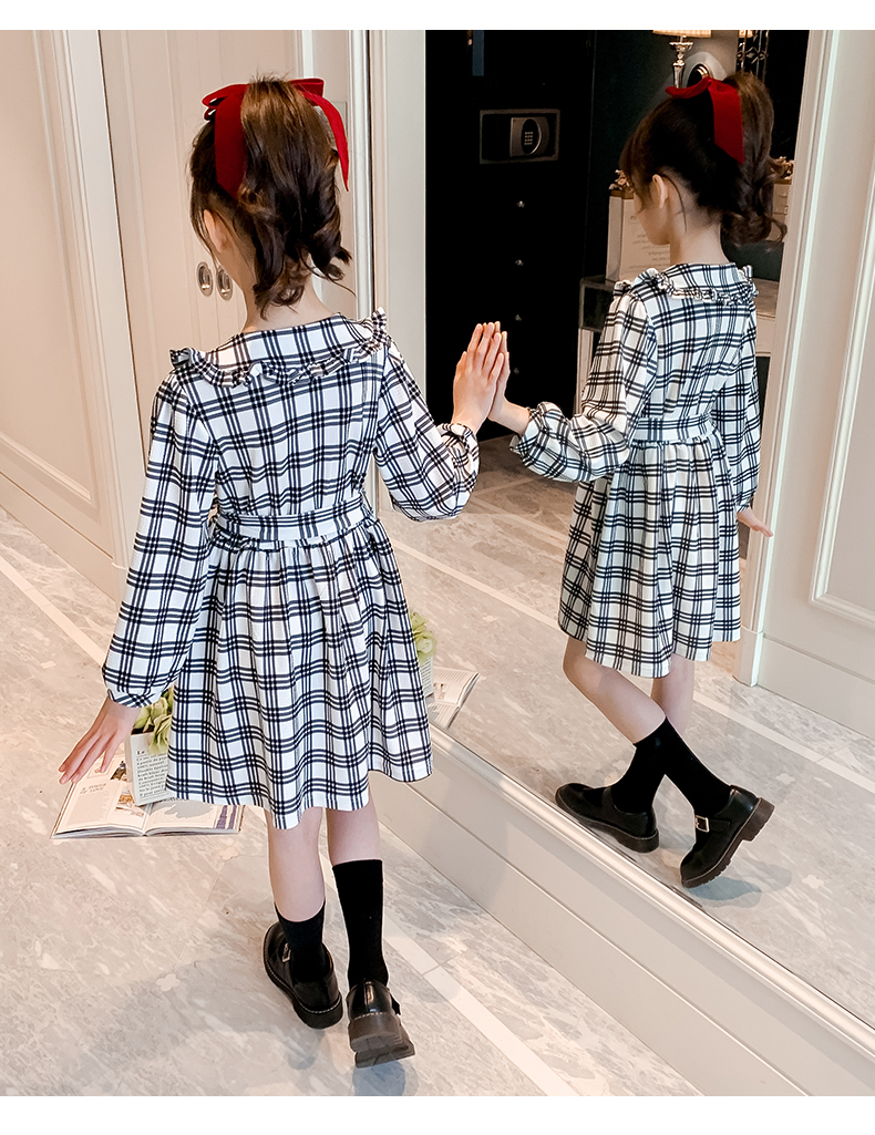 浪莎韓版女童花邊翻領黑白格子連衣裙2021春裝新款兒童長袖公主裙